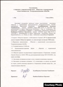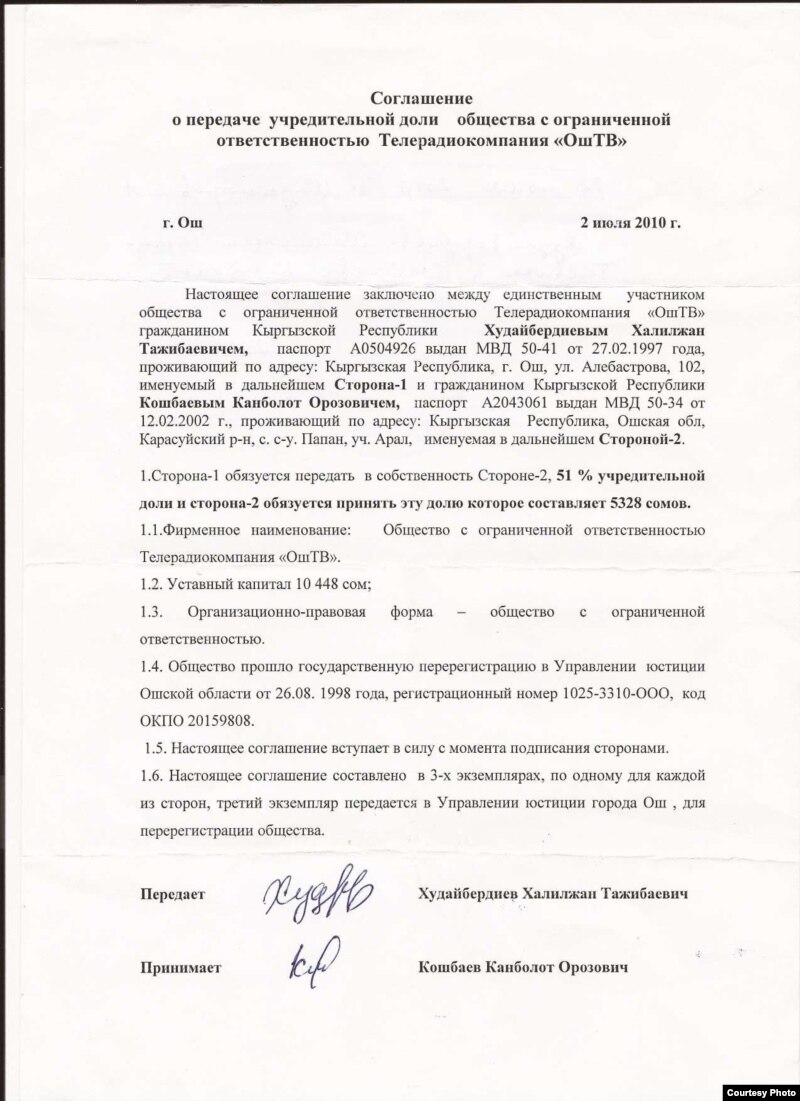 “Ош ТВ” компаниясынын баалуу кагаздарынын үлүшү тууралуу Х.Худайбердиев менен К.Кошбаев кол койгон 2010-жылдын 2-июлундагы талаштуу келишимдин фото көчүрмөсү. 1-бет. Орусча. Х.Худайбердиев бул сүрөттү “Азаттыкка” Батышта бозгунда жүрүп жиберген. 24.02.2011.