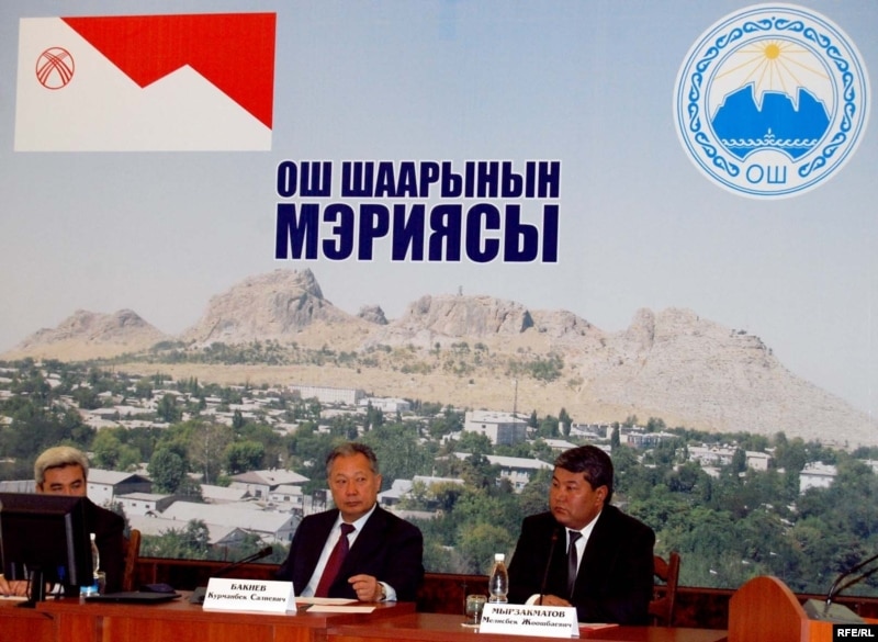 (Ошол кездеги) Президент К.Бакиев Ош шаарынын өнүгүү концепциясынын жүз ачаарына катышууда (оң жагындагысы – Ош шаарынын мэри Мелис Мырзакматов), 2010-жылдын 20-марты.
