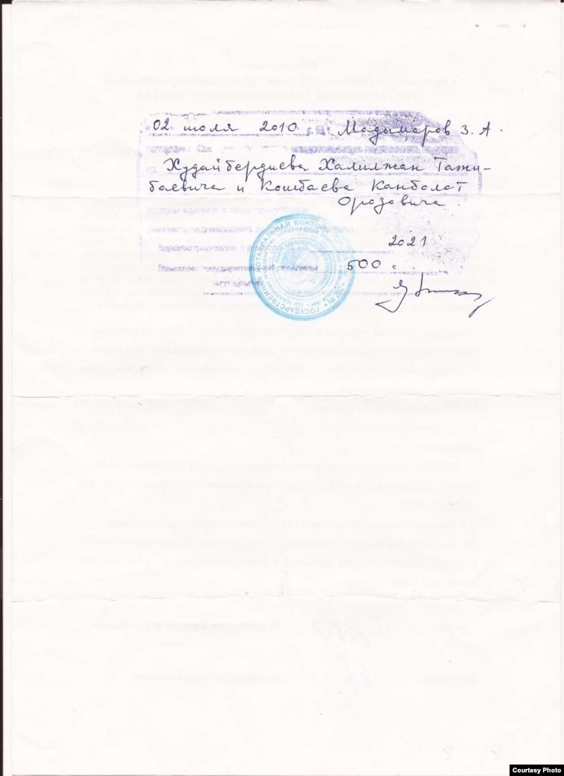 “Ош ТВ” компаниясынын баалуу кагаздарынын үлүшү тууралуу Х.Худайбердиев менен К.Кошбаев кол койгон 2010-жылдын 2-июлундагы талаштуу келишимдин фото көчүрмөсү. 2-бет. Нотариалдык күбөлөндүрмө кол. Орусча. Х.Худайбердиев бул сүрөттү “Азаттыкка” Батышта бозгунда жүрүп жиберген. 24.02.2011.